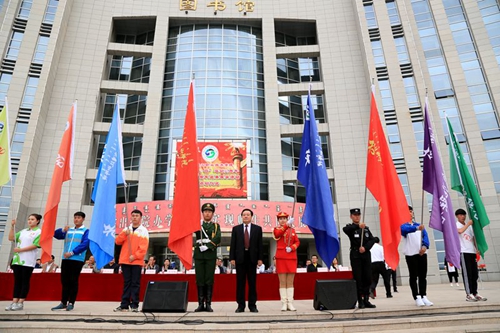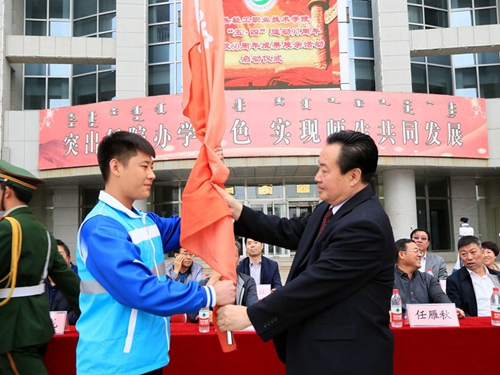 党委书记敖旭鹏分别为学校国旗护卫队、女子管乐团、志愿者联合会、校卫队、大学生通讯社、大学生自治联合会、文明引导志愿服务队、学生环保联合会8个大学生组织授旗