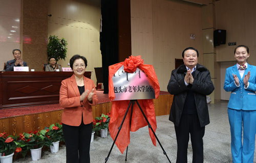 包头市政府副市长乌云,包头轻工职业技术学院党委书记敖旭鹏为“包头市老年大学包头轻工职业技术学院分校”揭牌。