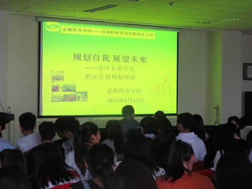 6月15日下午,金融财务学院在图书馆509会议室为2015届的毕业生组织了一场主题为“规划自我,展望未来”的专题讲座。包头芸瑞财税咨询有限责任公司的总经理王瑞玲、行政主管李丹、课程顾问付聿韬,金融财务学院的领导及相关老师参加讲座,由金融财务学院副院长乔雪芹主持。