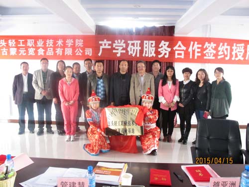 4月15日,党委委员、乳品工程学院院长武建新,乳品工程学院党总支书记雒亚洲及专业教师管建慧、乌雪岩、沈珺、韩永霞、崔丽娟等一行7人,来到内蒙古蒙元宽食品公司,对企业进行参观调研并进行了产学研服务合作签约授牌仪式。内蒙古蒙元宽食品有限公司董事长赵富元同志带领党支部书记张璘、销售部经理王伟、生产部经理王艳平、生产部主任高伟、财务部经理吕灵、人事部主管韩建明、综合部经理庄引弟及综合部其他人员参加了签约授牌仪式。