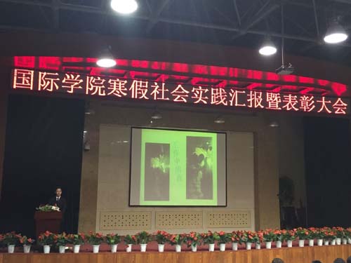 大会首先由每班学生代表进行寒假社会实践的汇报,把在寒假做的工作进行演讲,每一位认真深入到社会实践的同学都成为大家学习的榜样,每一段汇报的喜悦成果都成为同学们前进的动力。大会还对在2014-2015年度表现优秀的同学进行了表彰。张院长代表国际学院感谢了这些在过去的一年里表现突出的同学,希望大家以更加奋发有为的精神、求真务实的作风,再接再励,积极进取,希望在明年的表彰名单上,有更多的同学出现。