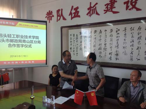 6月16日,包头青山区邮政局申彬峰局长与经济管理学院院长王高亮签订校企合作协议,双方在学校共同建设服务与教学两用的主题邮局,供物流专业学生工学交替、勤工俭学,主题邮局的业务范围包括快件投递、日常缴费、车辆保险承揽、包裹邮寄、信件收发等八项业务。