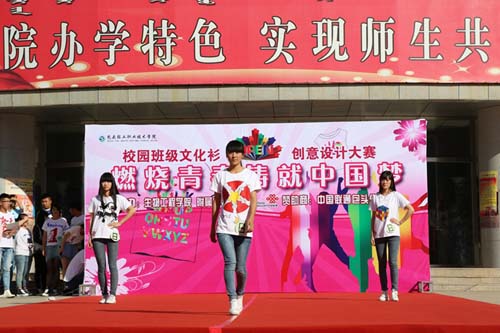 5月27日,活动月第一站校园文化衫班服创意设计大赛”在图书馆前隆重开赛,本次比赛坚持公平、公正、公开的原则由学生通过微校园”网络平台进行自主投票评选。选出学生心目中最完美、最具有班级特色的作品。最终附属中专学校三号作品机电2013小高职和生物工程学院十四号作品食品加工(营养与检测)123011班凭借着独特的设计、出色的绘制以及完美的展示获得了比赛一等奖。