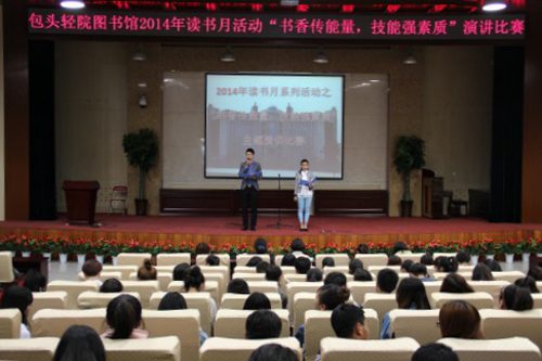 5月5日下午,为了激发同学们的学习热情,展现同学们积极向上的风貌,提高同学们的演讲能力,图书馆在一楼国际会议厅举办了包头轻院图书馆2014年书香传能量、技能强素质”主题演讲比赛决赛。图书馆馆长郭丽华、副馆长侯俊杰、部门主任及公共服务学院韩博老师担任本次比赛的评委。