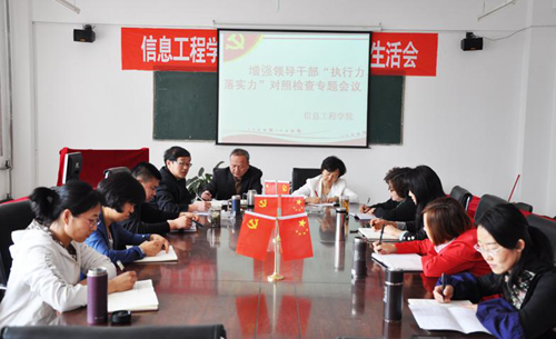 4月24日下午,根据学院党委印发的《学院开展增强领导干部执行力、落实力专项整治工作实施方案》文件精神,信息工程学院召开增强领导干部执行力、落实力专项整治工作专题会议,党委委员、组织人事处处长陈芳、信息工程学院院长张建军、党总支书记刘际平、副科级发上干部、全体党员参加了本次会议。会议对部门副科级以上干部开会讨论梳理出的三个方面的突出问题,张建军院长进行了汇报,党员同志们积极参加讨论,进一步查找问题,并制定了初步整改方案。