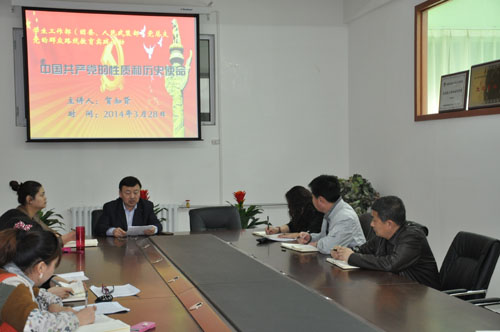 3月28日上午,为了继续深化教育实践活动学习效果,学生工作部(团委 人民武装部)党总支书记贺知贤同志在体育馆南楼215会议室以《中国共产党的性质和历史使命》为题做了党课讲座,学生工作部全体工作人员聆听了讲座。