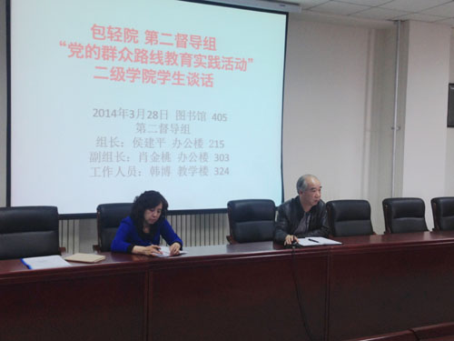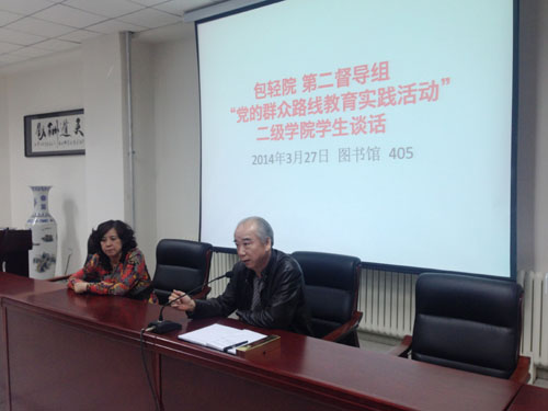 3月27日、28日,学院党的群众路线教育实践活动第二督导工作组在图书馆405室召开了两场教育实践活动学生座谈会。分别有化工学院、经济管理学院、能源工程学院、信息工程学、国际学院、农牧园林工程学院和公共服务学院的共计九十名学生代表参加座谈会。会议由督导组组长侯建平主持、副组长肖金桃老师和工作人员韩博老师对学生们反映的意见和建议都做了详细的记录。
