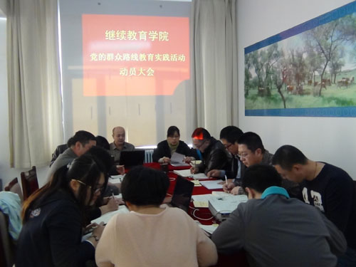 3月13日,继续教育学院召开党的群众路线教育实践活动动员大会,学院全体党员干部参加会议。继续教育学院院长白巴根作动员讲话,他强调,在学习中牢牢把握照镜子、正衣冠、洗洗澡、治治病”的总要求,牢牢把握为民务实清廉的主要内容,牢牢把握六个坚持”的基本原则。继续教育学院要抓住一个工作理念,突出三个工作中心,开创十个工作新局面”,即:抓住创新和特色为重点,服务为核心”的工作理念;突出成人高等教育、国家职业技能鉴定和培训三个中心工作的服务水平;开创成人招生宣传、职业技能鉴定服务质量、创业就业培训、建设成人高等教育远程服务平台、建立继续教育数据服务系统、设立高技能人才培训基地、成立高级技师学院、强化继续教育学院管理文化品牌和党支部建设工作新局面。把开展教育实践活动与做好学院中心工作结合起来,与党员干部履职尽责、发挥先锋模范作用结合起来,把开展教育实践活动作为推动学院各项工作的重要动力,做到教育实践活动与事业发展两手抓、两不误、两促进”,使教育实践活动每个环节、每项措施都为中心工作服务,用学院发展的成果检验教育实践活动成效。