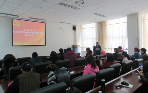 3月14日下午,国际学院在图书馆607室召开党的群众路线教育实践活动启动大会。国际学院院长吕林旺,党总支书记、副院长张健,院长助理李萍等出席启动大会。学院全体教职工、学生代表参加了此次大会。