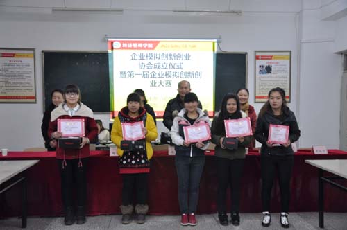 经济管理学院倡导发挥学生主观能动性,整个大赛从策划到组织均由企业模拟创新创业协会承办,该协会成员来源于学院各年级各专业学生群体,从大赛准备到开赛历经3个月,学院为学生提供了技术支持和指导,协会成员利用晚自习和课余时间进行演练,并经常联系内蒙古科技大学、包头师范学院等兄弟院校的学生进行日常比赛。整个比赛在局域网进行,通过模拟动画人物进行企业模拟运营,运营中涉及企业注册流程、物流配送、产品设计、营销策划等相关环节,学生也在游戏中获得了专业技能知识,协会的成立带动了一批学生积极投身于专业技能的演练活动,增强了动手能力。经济管理学院院长王高亮对该次比赛和协会的成立给予了高度赞扬,并提出了几点期望,希望能够以老带新的方式将专业技能演练的方式继续传承下去;希望这样的活动可以为学生今后的工作提供有力的帮助;希望继续扩大该协会的队伍,发展新的成员。最后,工商企业管理专业2013级马鑫等同学获得了比赛的一等奖,市场营销专业2013级杜雯、曹诗雨、赵宇等同学获得了比赛的二等奖,工商企业管理2013级李颖等同学获得了比赛的三等奖,学院领导为获奖选手颁发了奖状及奖品。