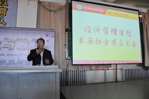 会议还进行了经济管理学院书画协会”的成立仪式,指导老师司建平宣布,经济管理学院院长王高亮老师为书画协会的荣誉会长,并介绍了协会成立的目的和组织机构。书画协会学生会长和副会长分别上台发言,对工作和目标进行了表态。
