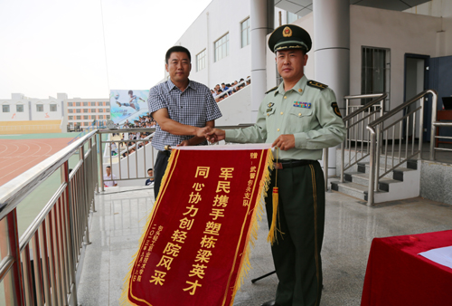 会上,党委委员、副院长辛利民代表学校向2013年军训承训单位武警包头支队赠送了题词为军民携手塑栋梁英才;同心协力创轻院风采”的锦旗。