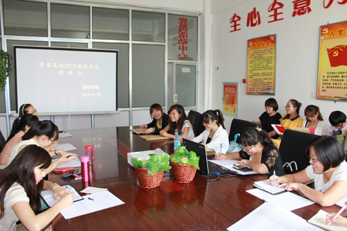 6月22日下午,国际学院召开2013届商务英语专业毕业生座谈会。国际学院副院长张健、院长助理李萍、学生科科长赵建军、专业英语教研室主任蒙静、专业英语组老师及毕业生参加了座谈会。