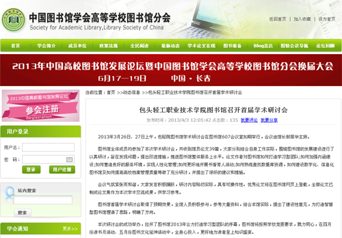 近日,中国图书馆学会高校图书馆分会官网对学校图书馆近期工作进行了系列报道,如包头轻工职业技术学院图书馆被包头市图书馆学会评为2011--2012年度先进单位”、包头轻工职业技术学院图书馆喜获包头市‘巾帼文明岗’殊荣”、包头轻院图书馆赴内蒙古工业大学及内蒙古财经学院图书馆参观学习”、包头轻工职业技术学院图书馆召开首届学术研讨会”等内容。在全国各大高校范围内广为宣传,对于提升我校图书馆在全国图书馆界的知名度、美誉度,加强对外交流合作,起到了很好的促进作用。