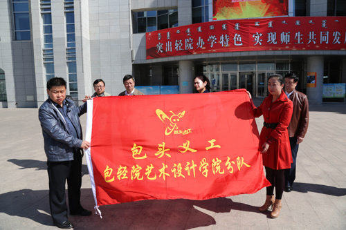 4月2日下午,艺术设计学院在图书馆楼前举行包头市义工联合会向包头轻院艺术设计学院义工服务分队授旗暨学雷锋 献爱心 关爱老人 奉献社会”义工服务活动的启动仪式。副院长薛富、学生工作部部长贺知贤、团委书记林青及艺术设计学院院长邓树君,副院长罗峥、曹永霞出席了此次大会。参加此次大会的还有包头市义工联合会会长赵智慧,包头义工联合会后勤部部长方百海,以及内蒙古晨报、包头日报、包头晚报、北方新报、北方新报新周末”周刊等新闻媒体单位。