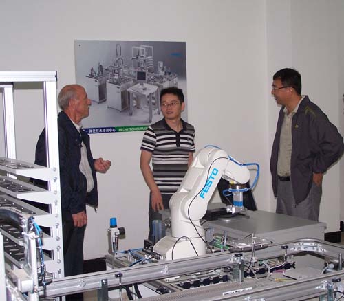 9月12日上午Eberhard Bauer先生参观了机电一体化FESTO培训中心,详细的了解了设备的配置情况和教学使用情况,并对电气液压实训设备进行了认真的检查,为即将到来的培训做准备。Eberhard Bauer先生认为机电一体化培训中心的设备达到了国际的一流水准,并对设备的教学使用和保养给出了很高的评价。参观后副院长侯建平同志和机电工程系领导与Eberhard Bauer先生进行了会谈。副院长侯建平同志对Eberhard Bauer先生的到来表示欢迎,对即将开展的培训表示期待,并预祝培训圆满成功。