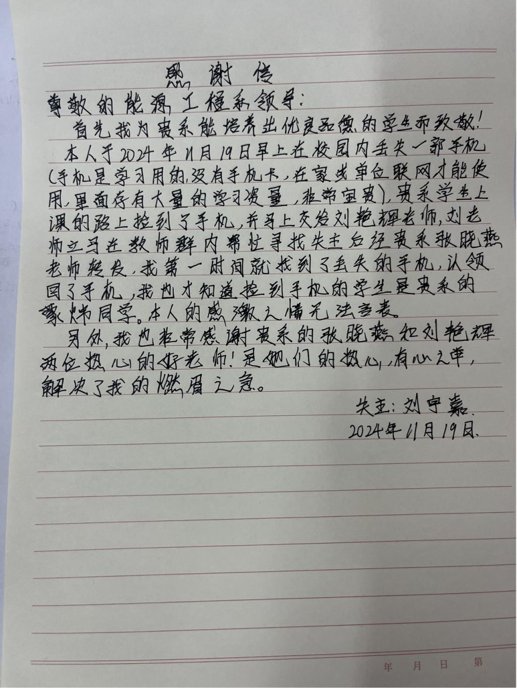孙婧老师在班里表扬了蒙炜同学拾金不昧的优良品质,并为全班同学上了一堂主题班会课。她告诉同学们:“勿以恶小而为之,勿以善小而不为。蒙炜同学俯下身去拾起的是中华民族传统美德,送还的是一颗至纯至美的心,他是大家的好榜样!”这封“沉甸甸”的感谢信是对能源工程系师生的最大鼓励,更是对学院教育工作的高度认可。