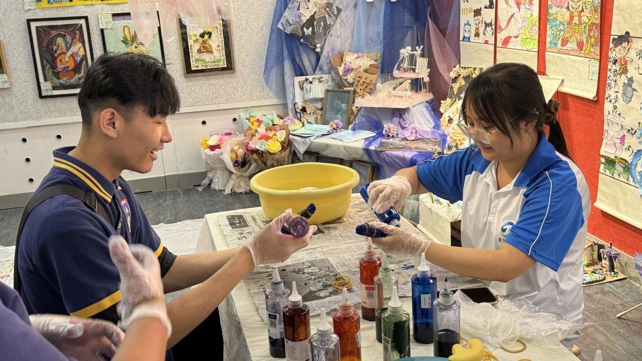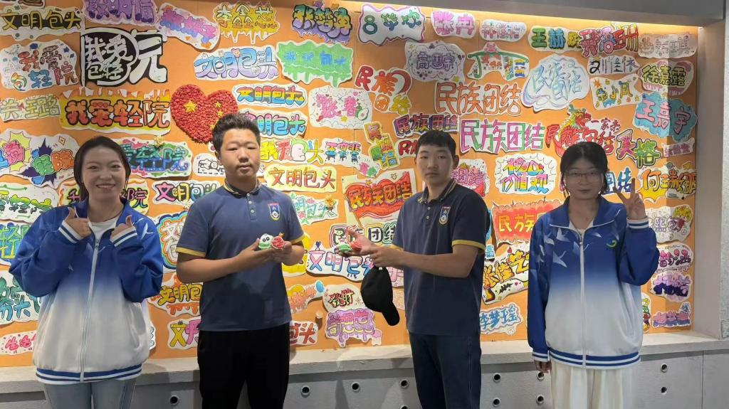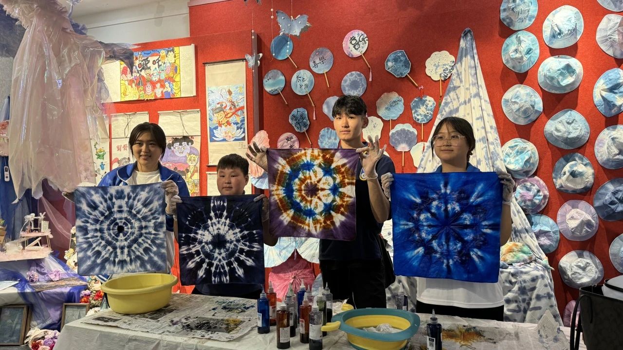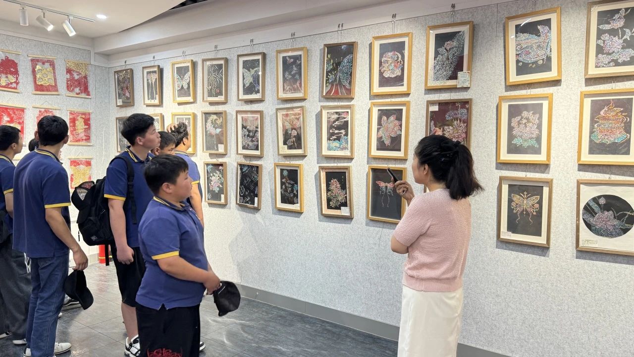 活动现场,讲解教师围绕北疆文化,向蒙古国研学师生讲述中华文化非遗技艺,详细介绍了扎染、掐丝珐琅、漆扇等非遗工艺中的中华民族智慧,分享了蕴含在作品中象征民族团结的“石榴籽”纹样。通过学生创作的石榴粽宝宝粘土作品、扭扭棒石榴花手工以及民族团结手抄报等作品,全面阐释了学院学前教育专业“以美育促进民族团结”的教学特色。蒙古国师生对木刻版画、金箔纸雕、掐丝螺钿、传统扎染等作品表现出了浓厚的兴趣,这些作品以中国传统纹样为背景,融合了民族与现代元素,是民族团结、守望相助的生动写照,青年学生在沉浸式体验中深刻感受工匠精神的时代价值,体悟“守正创新”的深刻内涵。